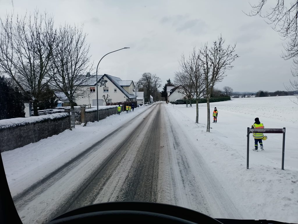 Der Dienst begann bereits in den frühen Morgenstunden unter erschwerten Bedingungen. Die anhaltende Glätte erforderte von den Kraftfahrern erhöhte Vorsicht und eine präzise Routenplanung, um die Sicherheit der Jugendlichen und des Materials zu jeder Zeit zu gewährleisten. Fachlich gesehen bot dieser Tag eine wertvolle Gelegenheit, das Bewusstsein für die Besonderheiten des Winterdienstes und die Ladungssicherung unter widrigen Umständen zu schärfen.